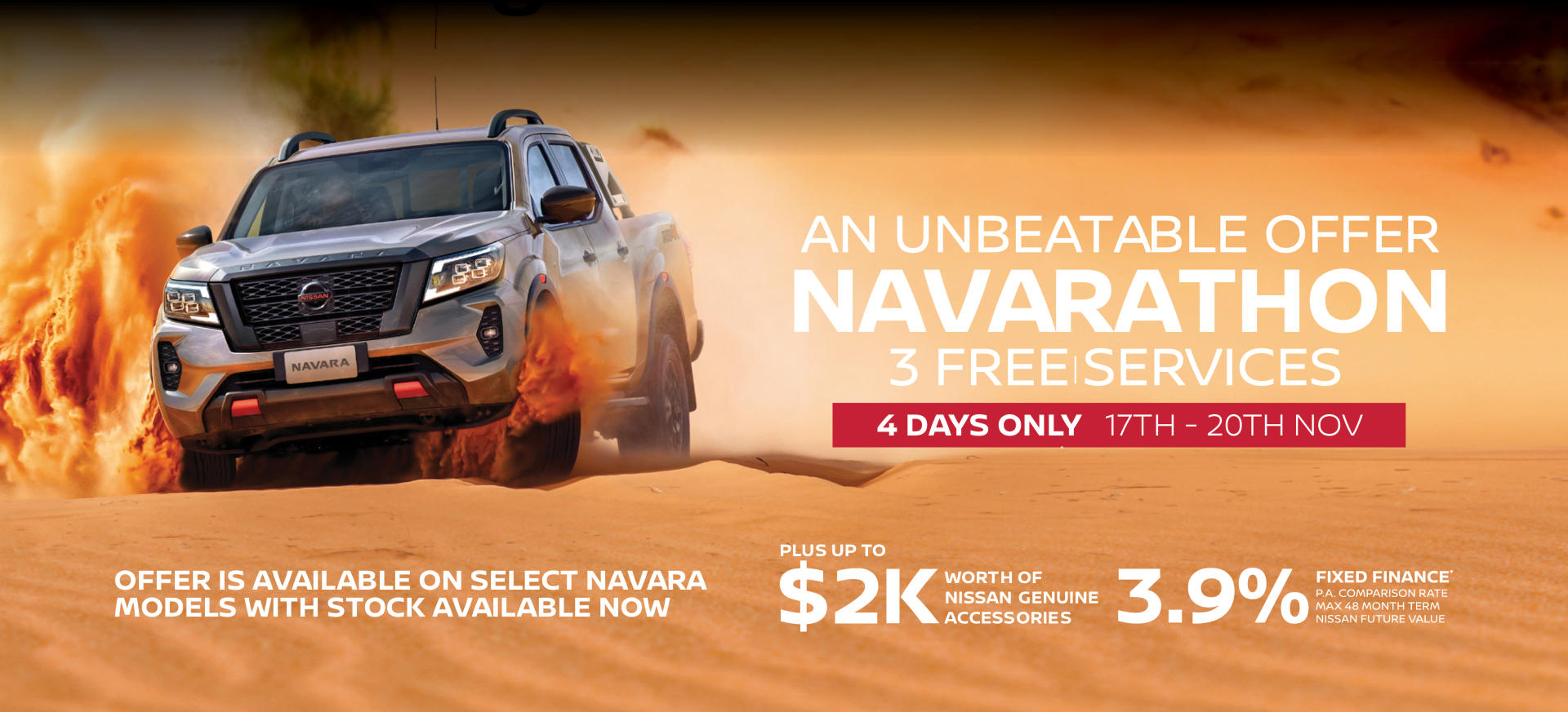 ~3 Free Services offer available on new and demonstrator SL, ST, ST-X and PRO-4X Navara 4x4 Dual Cab Pick-up vehicles (excluding PRO-4X WARRIOR variants) purchased between 17/11/2023 and 20/11/2023 and is valid for the first 3 standard Nissan Genuine Scheduled Services undertaken in accordance with Nissan factory servicing intervals. Refer to Owner’s Handbook for items included in a standard Nissan Genuine Scheduled Service for the vehicle. Additional service/repair items will be at additional cost. *Terms and conditions apply. 3.9% Comparison rate for approved personal applicants of Nissan Financial Services (Australian Credit Licence Number 391464) (NFS). 3.9% APR. Maximum 48 month term. WARNING: This comparison rate is true only for the example given and may not include all fees and charges. Different terms, fees or other loan amounts might result in a different comparison rate. This comparison rate for the purpose of the National Credit Code is based on a 5 year secured loan of $30,000, although this offer relates to a 48 month term only. Under the Nissan Future Value (NFV) program, you can return the vehicle back to NFS for the pre-agreed future value (adjusted for excess kilometres and the cost of repairs for vehicle damage beyond fair wear and tear), to pay the final balloon payment on your loan. Allowed kilometres and vehicle condition requirements are set out in the NFV agreement. Offer available on new and demonstrator SL, ST, ST-X and PRO-4X Navara 4x4 Dual Cab Pick-up vehicles (excluding PRO-4X WARRIOR variants and demonstrators over 5,000km or 6 months from registration) purchased by 30/11/2023. For more information see Nissan.com.au/NissanFutureValue. Accessory bonus of up to $2,000 (inc. GST) to be used towards purchase price and fitment of Nissan Genuine Accessories at time of purchase of eligible vehicle. Accessory bonus is not transferable, not exchangeable and cannot be redeemed for cash. Excludes Government, Rental and National Fleet customers. Nissan reserves the right to vary, extend or withdraw this offer.